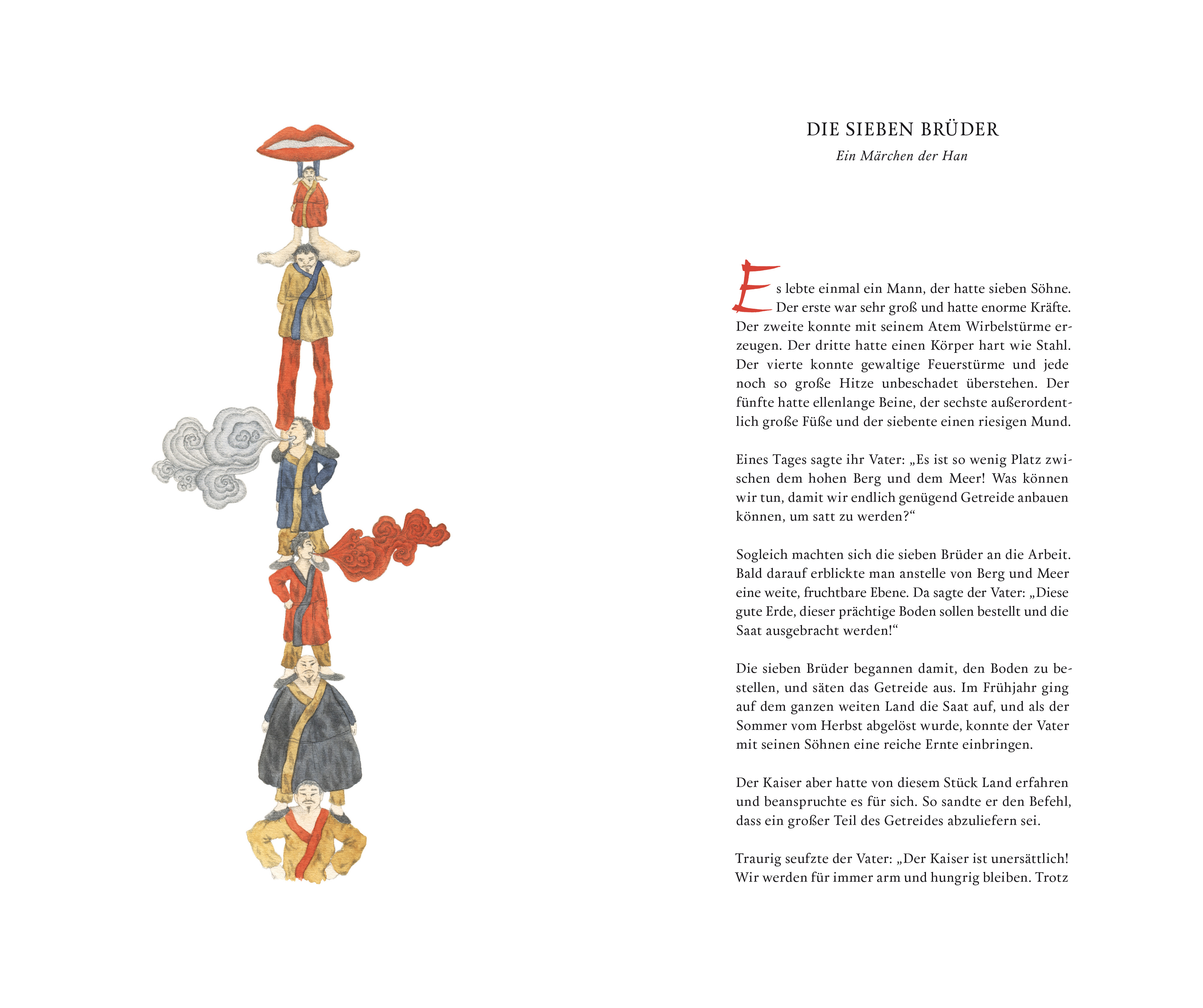 Sieben Brüder mit märchenhaften Fähigkeiten, listige Berater, ein böser Kaiser und eine gemeine Königin – es versammeln sich viele bekannte Figuren. Und doch, auch wenn das Gute immer siegt und die braven Reisbauern glücklich bis an ihr Ende leben, so schwingt immer etwas exotisches, ja fremdes mit und macht diese Märchen zu viel mehr als unterhaltsamen Kindergeschichten.