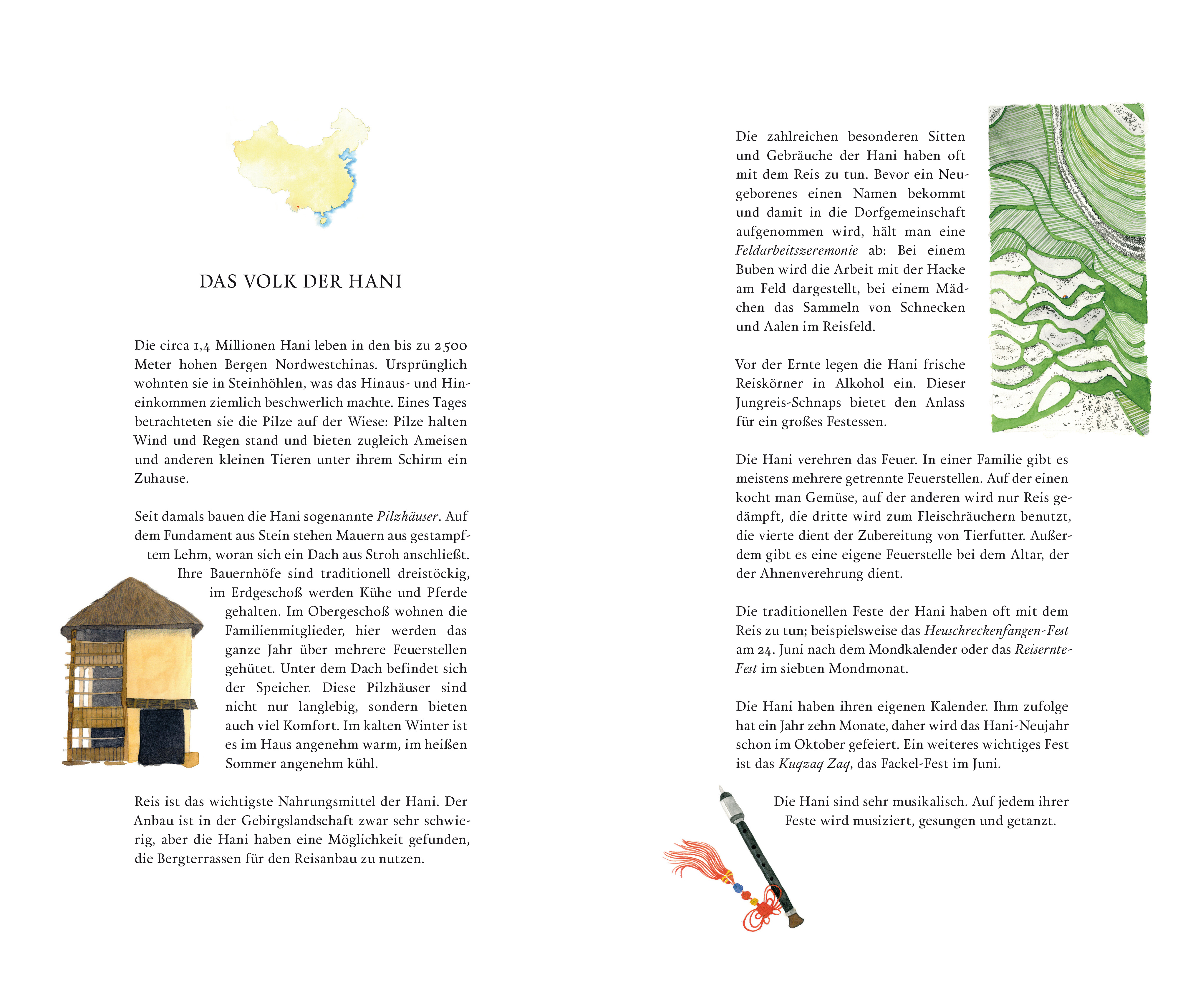 Mit 36 farbigen Illustrationen, sowie Informationen zu den verschiedenen Volksgruppen und einer kurzen Einführung zu „chinesischen Märchen“.